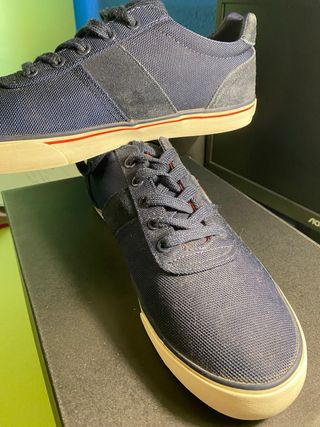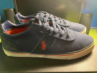 Zapatos casuales de la marca Polo Ralph Lauren. - Diseño de lona en color azul. - Detalle del logo del jinete en color rojo. - Forro interior en color naranja. - Suela de goma blanca con detalles rojos.