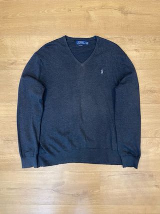 Jersey de punto fino con cuello en V. -Usado dos veces - Logo del caballo bordado en el pecho. - Manga larga.
