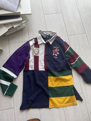 Polo de manga larga de Polo Ralph Lauren con un diseño patchwork llamativo. Más bien M. 45 ancho hombro, 50 ancho, 60 manga y 70 largo - Diseño de patchwork con múltiples paneles de colores. - Detalle de escudo y número '10' bordado. - Cuello clásico de polo.