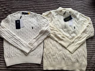 Se venden dos suéteres Polo Ralph Lauren nuevos con etiquetas, sin uso. Fue un regalo, pero no acertamos con las tallas y me vienen pequeños. Marca: Polo Ralph Lauren Estado: Nuevos, con etiquetas Modelo 1 (izquierda) Talla: S mujer Color: Blanco / crema Diseño: Cable Knit clásico con cuello redondo Logo bordado en el pecho Modelo 2 (derecha) Talla: M hombre Color: Blanco / crema Diseño: Cable Knit con cuello alto y media cremallera Logo bordado en el pecho Características destacadas Tejido de punto grueso y de algodón Muy suaves, cálidos y elegantes Acabados acanalados en puños y bajo Prendas atemporales. Envío el mismo día