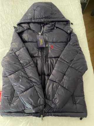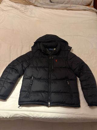 Vendo chaqueta acolchada Polo Ralph Lauren en color azul marino, en muy buen estado. Es una prenda de gran calidad, muy cálida, ideal para otoño e invierno. Tiene capucha integrada, cierre de cremallera, bolsillos laterales y el clásico logo bordado en rojo en el pecho. Diseño elegante y deportivo que combina con todo.