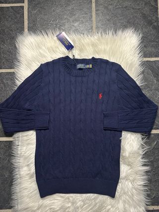 Jersey de punto trenzado en color azul marino. Presenta el icónico logo del jinete bordado en rojo en el pecho. - Cuello redondo. - Puños y bajo acanalados.