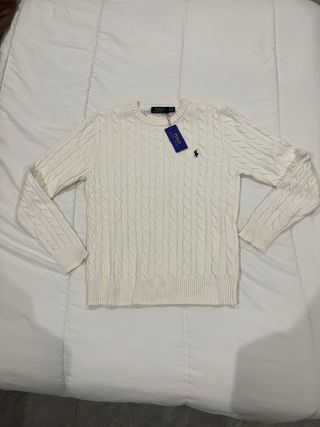 Suéter clásico de punto trenzado en un elegante tono marfil (blanco roto). Cuenta con cuello redondo, mangas largas y puños, bajo y cuello acanalados. Terminado con el emblemático logo bordado de Polo Ralph Lauren en el pecho. Talla: XXL Corte: holgado / relajado Material: viscosa (material principal) Color: marfil / blanco Estilo: casual, preppy, clásico Estado: excelente — usado solo un par de veces; se vende porque la talla es demasiado grande para mi esposo.