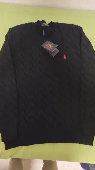 Jersey de punto trenzado en color negro. - Diseño clásico con el icónico logo del jinete bordado en rojo. - Cuello redondo y manga larga.