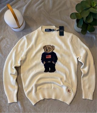 Jersey de Polo Ralph Lauren con un diseño clásico del oso. - Color blanco roto. - Detalle de oso con la bandera de Estados Unidos. - Cuello redondo y manga larga. - Medidas 68cm de largo, 45cm hombros