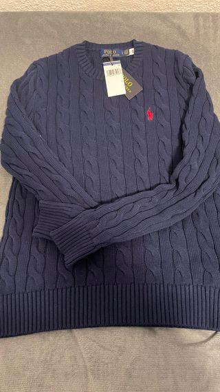 Jersey de punto trenzado en color azul marino. - Cuello redondo. - Manga larga. - Logo de la marca bordado en el pecho. -Talla s -calidad 10/10 -sin usar