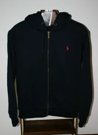 Sudadera con cremallera y capucha de la marca Polo Ralph Lauren en la talla M. en color azul marino y con el logo bordado en el pecho en color rojo Nueva con etiquetas Talla M Medidas: 56 cm de axila a axila 67 cm de largo Sudadera con cremallera completa de Polo Ralph Lauren. - Logo del jugador de polo bordado en rojo en el pecho. - Capucha con cordón ajustable. - Bolsillo tipo canguro. - Puños y dobladillo acanalados.