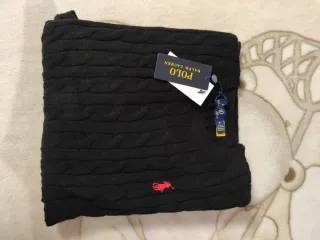 Jersey de punto trenzado de Polo Ralph Lauren. - Diseño clásico con cuello redondo. - Logo del jugador de polo bordado en rojo en el pecho. - Puños y bajo acanalados. -Calidad: 10/10 -Envío en menos de 48h -Largo: 61cm. Hombros: 40cm. Ancho:45cm. Cintura 39cm. Mangas: 61cm. Ancho de mangas: 15cm. Ancho de mangas muñeca: 10cm