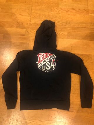Se vende un jersey tipo sudadera de marca Polo Ralph Lauren en color azul marino con detalles en rojo y la bandera de EEUU en el brazo izquierdo, cuenta con capucha y bolsillos a la altura del estómago estilo sudadera pero puesta queda como un jersey, talla 18 - 20 de niños qué equivale a una talla S o M en adulto, esta en buen estado, ha sido poco usada y bien cuidada