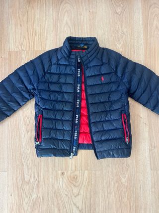Chaqueta plumífero para niño de la marca Ralph Lauren. - Color azul marino. - Forro interior rojo. - Detalle de logo rojo en el pecho. - Cremallera frontal con cinta de logo. - Bolsillos laterales con ribete rojo. Es la talla 6 pero talla pequeño, para niño 5 años perfecto. Acolchado, impermeable.