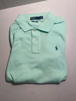 Polo clásico de la marca Polo Ralph Lauren en color azul. La prenda que has mostrado es un polo de Polo Ralph Lauren para niño/juvenil. Características de la prenda: Marca: Polo Ralph Lauren Color: Un tono de azul claro o celeste. Talla: L (14-16) G, que corresponde a una talla grande de la línea juvenil. Estas tallas a menudo se ajustan a hombres delgados o mujeres de talla pequeña a mediana. Estilo: Polo clásico de manga corta hecho de tela de piqué. - Logo del caballo bordado en el pecho. - Cuello tipo polo con botones.