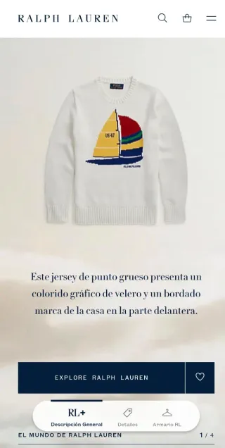 Jersey de punto Polo Ralph Lauren con un diseño de barco de vela. Es talla S de adultos y XL de niños - Color blanco. - Detalle de barco de vela en el frontal. - Cuello redondo y manga larga.