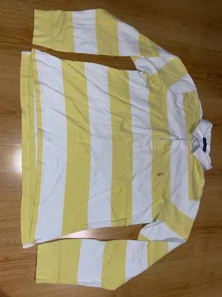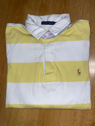 Talla XL de niño, equivalente a una S de adulto Polo de manga larga con rayas amarillas y blancas. Presenta el icónico logo del jinete bordado en el pecho. - Cuello blanco. - Cierre de botones. - Tejido de algodón.