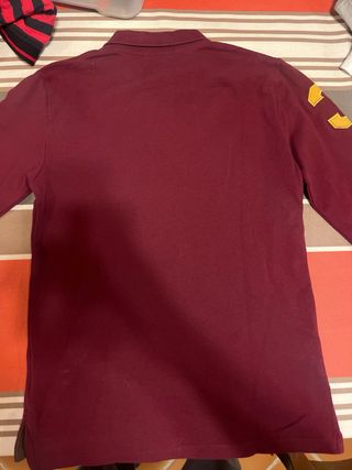 Polo de manga larga para niño de la marca Polo Ralph Lauren. Color granate con el icónico logo bordado en dorado en el pecho. Perfecto estado - Logo de jinetes a caballo bordado. - Cuello tipo polo con botones. - Manga larga.