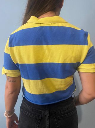 Este top corto de Polo Ralph Lauren es una pieza única y personalizada. Es talla L porque es de niño, pero será como una S de mujer. - Diseño de rayas azules y amarillas. - Corte crop top moderno. - Logo de la marca bordado. 📸 @2ndround.vintage