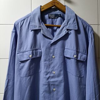 Camisa de seda , algodón y lino en color azul, con cuello camp , con cierre con botones , dos bolsillos con solapa en pecho, corte vintage 80's Talla XL ver medidas en fotografías Usada un pequeño agujero en la manga y algún signo de uso ver fotografías TAGS: preppie preppy vintage rrl shirt Ivy league hawaian Style camp collar silk cotton linen chemise soie cotón lin