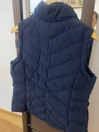 Chaleco vintage azul marino acolchado original de los 70’s 80’s interior plumón de OCA natural para mujer talla S, es razonable esperar un precio desde unos 65 € como mínimo hasta alrededor de 180 €, Chalecos similares de líneas recientes o sub-marca pueden costar entre 150 € y 350 €, pero no corresponderían a piezas vintage estrictas. - Capucha desmontable con ribete de pelo sintético. - Dos bolsillos frontales con solapa y botón. - Cierre de botones a presión en la parte delantera.