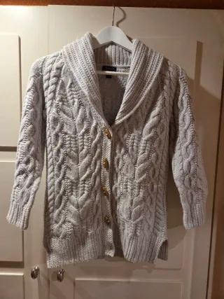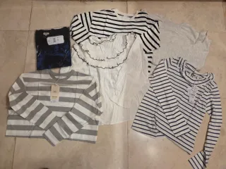 Lote compuesto por: Chaqueta de punto con diseño trenzado de Ralph Lauren de lana talla 10. - Cuello tipo chal. - Cierre de botones. - Puños y bajo de canalé. 1 camisa de Zara talla 9, con cuello y volante, tela tipo plumeti. 1 sudadera talla 10 de Zara color blanco pieda con volante en las mangas de Zara 4 camisetas de rayas de varios tipos y colores talla 10, de Mango, Zara y First Outlet. Muchas de ellas sin estrena como se aprecia en la foto. Se venden por separado percio por unidad, camisetas y sudadera 5€, camisa 7€ y chaqueta 30€