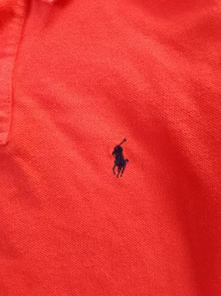 Polo de manga corta para hombre de la marca Ralph Lauren. En muy buen estado. Lo he comprado así de segunda mano y no me lo he puesto porque me esta grande. Es una talla M bastante amplia, es mas bien una L. Corte clásico. - Color azul claro. - Logo del jugador de polo bordado en naranja en el pecho. - Cuello clásico. - Cierre de dos botones. - Dobladillo con doble costura.