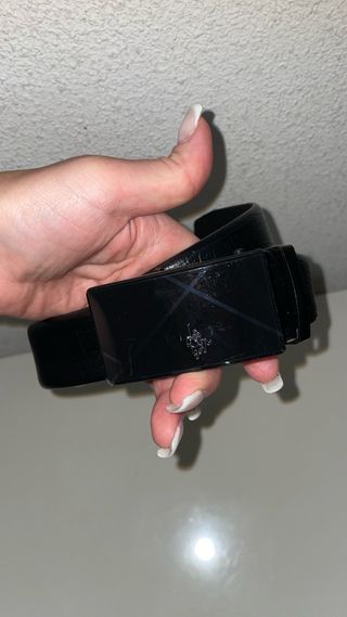 Elegante cinturón de Polo Ralph Lauren color negro. La hebilla metálica presenta un diseño grabado. - Diseño de la hebilla con líneas geométricas. - Detalle del logo de Polo en la hebilla.
