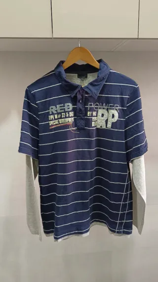Precioso Polo / camisa chico / hombre 📎 Manga larga 📎 Color azul y gris a rayas 📎 Tejido suave y de alta calidad 📎 1 puesta 📎 Talla XXL Medidas en las fotos Más artículos en mi perfil para tu lote perfecto 🛍️ #anita_g_g_man Ropa hombre / camisa / camiseta / top / trabajo / uso diario / chico / vestir / uso diario Polo de manga corta con diseño de rayas y detalles gráficos. - Cuello tipo polo con botones. - Estampado frontal con texto RED POWER y RP. - Manga larga gris debajo.