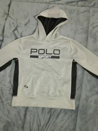 Sudadera Polo Sport de color gris, talla M de niño (11/12 años). Sin manchas ni roturas, tiene unos huecos en la manga para meter el dedo pulgar. Perfecta para hacer deporte
