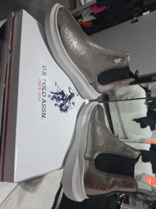 Zapatillas de la marca U.S. Polo Assn. en talla 38. Son nuevas y tienen un acabado plateado brillante. - Diseño tipo botín Chelsea. - Suela blanca de plataforma.