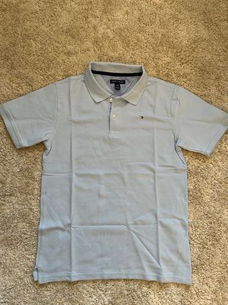 Polo original Tommy Hilfiger en color gris claro, diseño clásico de manga corta con logo bandera bordado en el pecho. Estado: Nuevo sin etiquetas Marca: Tommy Hilfiger Color: Azul claro Talla: 16 de niño / XS hombre