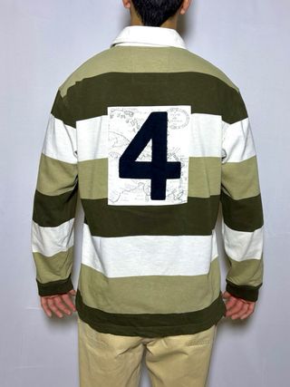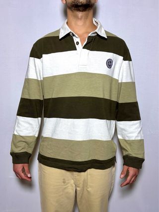 Polo de manga larga Pedro del Hierro en tonos caqui y verde oliva con detalle de mapa y número 4 en la espalda. En perfecto estado, talla XXL con corte clásico (60cm de axila a axila, 62cm de manga y 70cm de largo). Tejido de alta calidad.