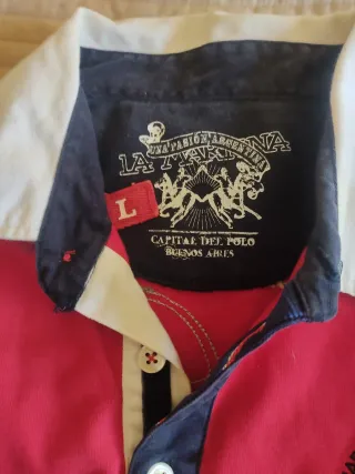 Polo de manga larga de la marca La Martina. - Cuello blanco y detalles en azul marino. - Escudo bordado en el pecho izquierdo. - Diseño con temática de polo y La Marina University en el pecho derecho.