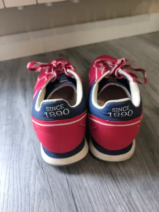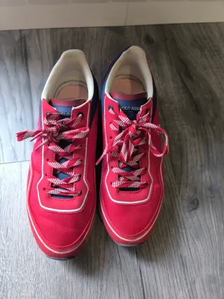 Zapatillas deportivas de la marca US Polo Assn de la talla 42 en muy buen estado - Color principal rojo con detalles en azul. - Cordones a cuadros en rojo y blanco.
