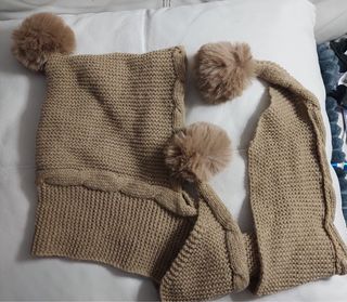 Conjunto de gorro y bufanda tejido en tono marrón, con detalles de trenzado y pompones. - Adornos de 3 pompones. - Interior del gorro de forro polar - Nuevo sin ningun uso, ideal como regalo