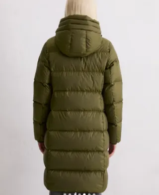 Abrigo plumífero largo color verde oliva. A estrenar, con etiquetas No negociable Envío inmediato Talla 36 - Capucha integrada. - Cierre de cremallera frontal.