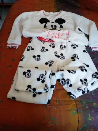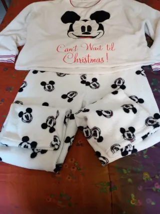 Conjunto de pijama polar con estampado de Mickey Mouse, perfecto para la temporada navideña. La parte superior es blanca con un gran dibujo de Mickey y el texto Wait 'til Christmas!. - Pijama de dos piezas. - Material polar muy suave. - Diseño divertido de Mickey Mouse. - Ideal para estar cómodo en casa durante las fiestas.