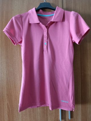 Preciosa camiseta polo de manga corta. Es de color rosa y luce impecable. - Marca: Proton - Talla S - Cuello y puños con ribetes turquesa