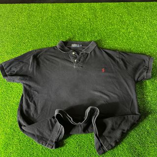Camiseta negra de manga corta con cuello en V. Presenta un pequeño logo bordado en el pecho. Con bastante uso, pero utilizable. - Cuello en V. - Logo bordado en el pecho.