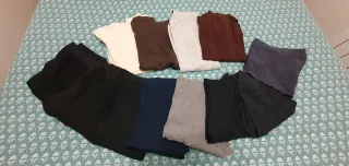 Pack de 14 prendas de ropa, ideal para no pasar frio en trabajos al aire libre, propias para ponertelas debajo de la ropa habitual. - Incluye 5 polos, 7 leggings mujer y 2 de hombre. - Variedad de colores: beige, negro, azul, marrón, morado y gris. - Algunas prendas más usadas que otras, pero todavia tienen vida. - Talla L y XL