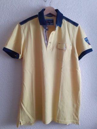 Niqui / polo Lion of Porches de manga corta. Color amarillo con detalles en azul marino en cuello, mangas y hombros. Logo en manga. 3 botones de cuello a pecho. Bolsillo abotonado en pecho, lado izquierdo. Boton de reemplazo adherido a etiqueta. 100% algodon. Talla M, Tailored Fit. Moda hombre. Perfecto estado. 15 euros