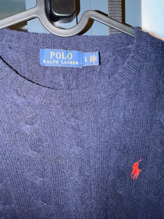 Jersey de Polo Ralph Lauren, nuevo y con etiquetas. - Diseño de punto trenzado. - Logo del jinete bordado en el pecho. - Cuello redondo y manga larga.