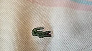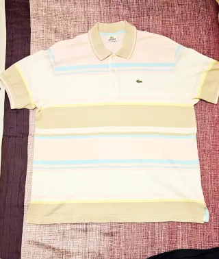 Polito Lacoste talla 6 "L" , de manga corta con un diseño de rayas multicolor. Cuello camisero y cierre de botones. - Diseño a rayas en tonos pastel y beige. - Logo del cocodrilo bordado en el pecho.