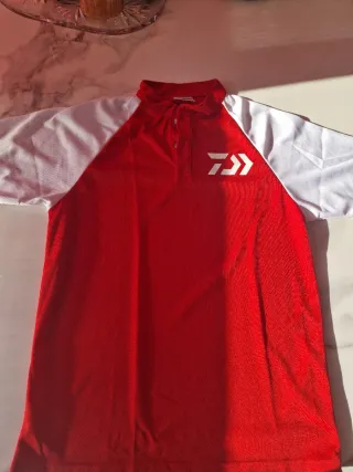 Polo de manga corta con diseño deportivo. - Cuello tipo polo con botones. - Mangas blancas y cuerpo rojo. - Logo de Daiwa en el pecho.