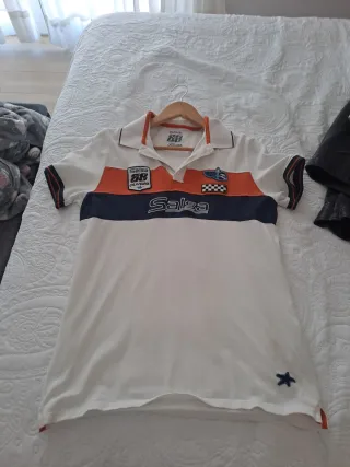Camiseta tipo polo de la marca Salsa. - Diseño con franjas naranjas y azul marino. - Detalles de parches y logo. - Cuello y puños con ribete.