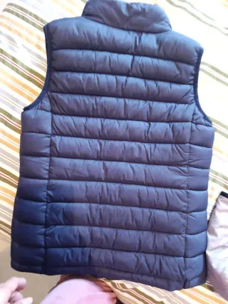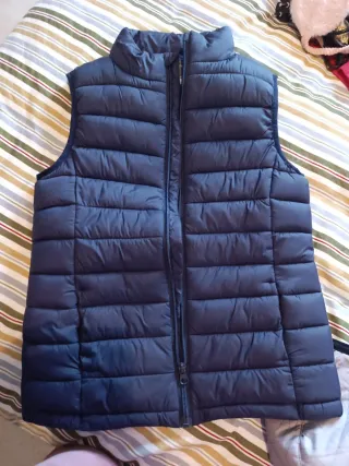 Chaleco acolchado de color azul marino, ideal para añadir una capa extra de abrigo. - Cierre completo con cremallera. - Cuello alto. - Diseño acolchado horizontal.