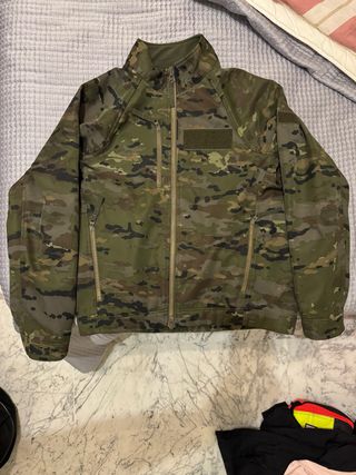 Forro polar de estilo militar en color beige. Es una prenda cómoda y cálida. - Cierre completo con cremallera. - Dos bolsillos laterales con cremallera. - Bolsillo en el pecho. - Parche de la bandera de España en la manga.