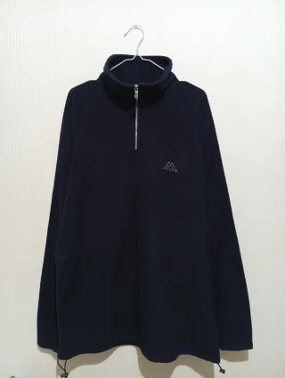 Forro polar vintage de color azul marino con cuello alto y media cremallera. - Logo de Kappa bordado en el pecho. - Tiene goma ajustable en la parte de abajo. - En buen estado, sólo tiene una pequeña marca en la parte de abajo por detrás, se muestra en las fotos. Talla XL, ver medidas en las fotos.
