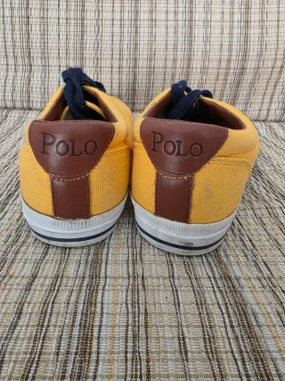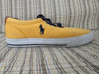 Zapatillas de lona con el icónico logo del jinete. - Color amarillo vibrante. - Detalle de cuero en el talón. - Cordones azul marino. - Suela de goma blanca.