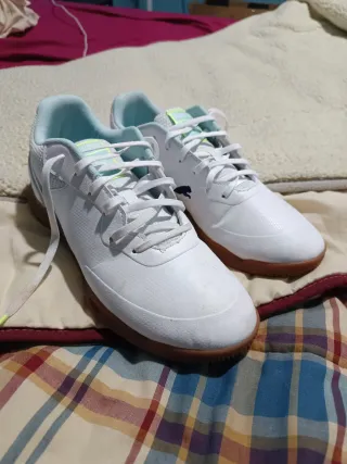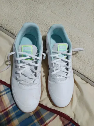 Botas de futsal Puma Truco 3. - Color blanco con detalles en azul y verde lima. - Suela de goma marrón. - Cierre con cordones blancos. - Talla 42 apretada - Usadas una vez y ya
