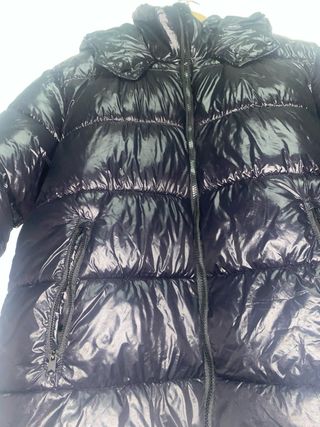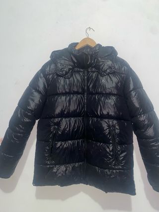 Chaqueta acolchada con acabado brillante y capucha. - Cierre de cremallera. - Bolsillos laterales con cremallera. - Diseño similar a la chaqueta moncler. - Se vende porque la talla es muy grande - Usada 3 veces - Fue comprada por 60