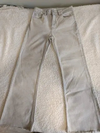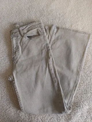Vaqueros tipo flare acampanado en color gris. - Cintura alta. - Pierna ancha. - Bajo deshilachado. Sientan muy bien y en muy buen estado. Talla XS