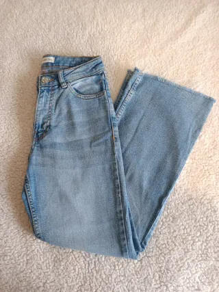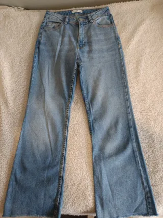 Vaqueros azules estilo flare acampanado. Mango teen - Cintura alta. - Cierre de cremallera y botón. - Bolsillos delanteros y traseros. - Bajo con corte desflecado. Están como nuevos. Talla XS